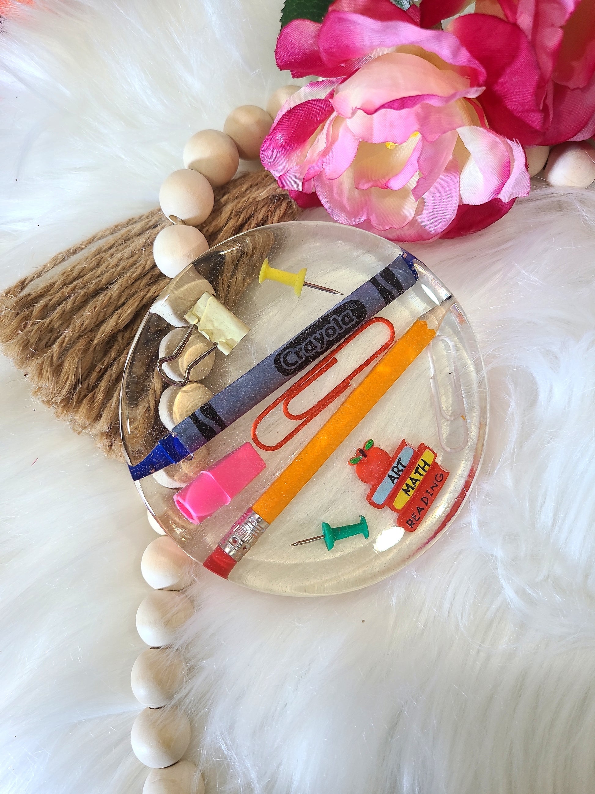 This listing is for ONE (1) coaster made with glitter and multiple layers of high-quality artist epoxy resin. Coasters are filled with school supplies such as crayons, pencils, paper clips and binder clips etc.